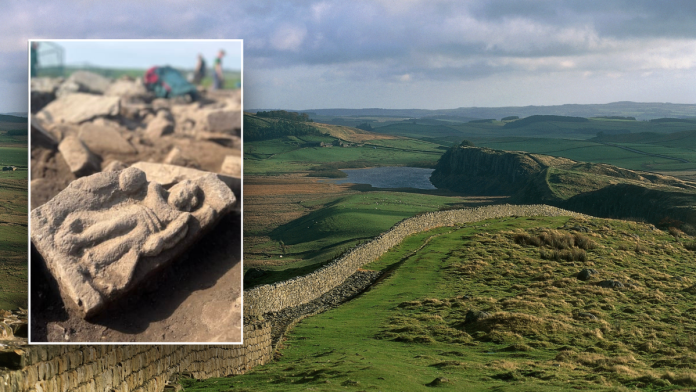Volunteers recently discovered an ancient Roman goddess depiction, shown in inset, at Vindolanda near Hadrian’s Wall — highlighting the site’s historical significance. (The Vindolanda Trust; Getty Images )