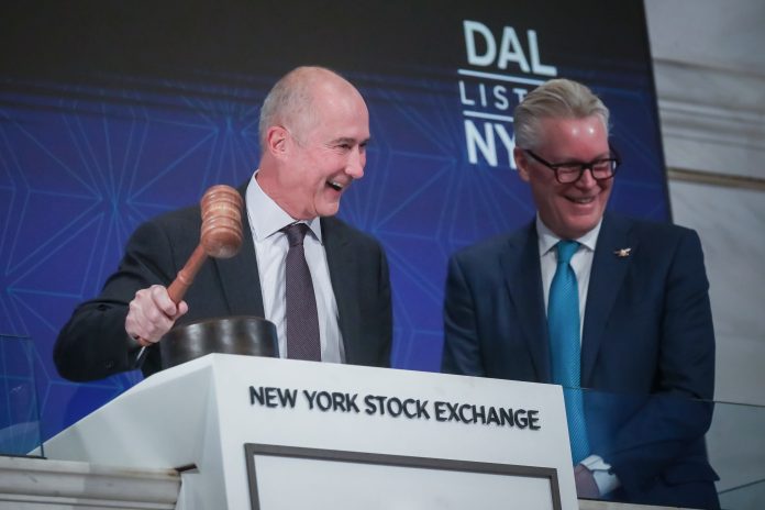 Glen Hauenstein, president of Delta Air Lines Inc., left, and Ed Bastian, chief executive officer of Delta Air Lines Inc., right, ring the opening bell on the floor of the New York Stock Exchange (NYSE) in New York, US, on Wednesday, Nov. 12, 2025.