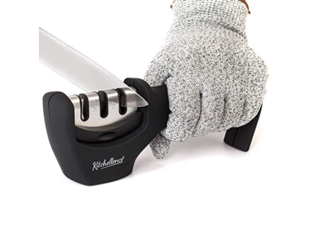 The Kitchellence sharpener looks like a handle with three notches in it. It’s ergonomically designed for comfort and lets you control the device. It sharpens your blade in a three-step process: You pull it through the first slot to take care of the big dents and grooves with the diamond-grit rod; the next slot returns the blade to its original V shape; and the third slot gives it a good polish. It also comes with a cut-resistant glove to keep you safe.