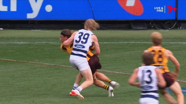 Hawthorn star Jack Ginnivan has admitted it’s “hard to watch” highlights of early playing days when he used his controversial shoulder shrugging technique to win free kicks.