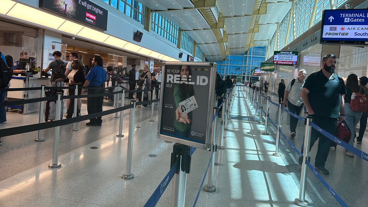 A REAL ID sign reminding travelers of the documentation they need is shown above in an airport this week.  (Fox News Digital)