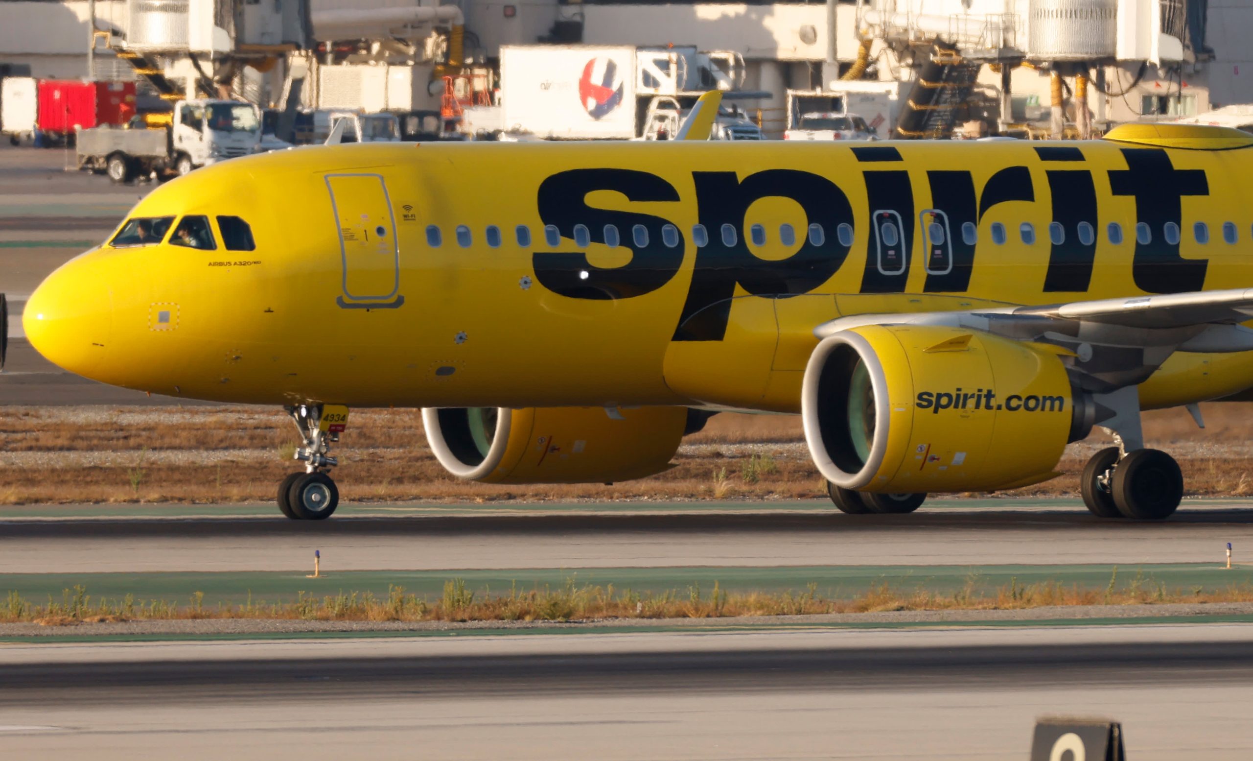 A Spirit Airlines Airbus A320 taxis at Los Angeles International Airport after arriving from Boston on September 1, 2024 in Los Angeles, California.
