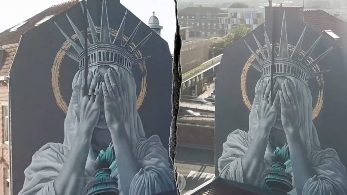 “The Statue of Liberty’s Silent Protest” was painted on a brick wall of a building on Rue de Chemin-de-Fer in Roubaix, France, by Dutch artist Judith de Leeuw. (See the video at the top of this article.)