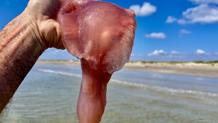 An unprecedented number of “pink meanie” jellyfish, a species that can grow up to 50 pounds with tentacles stretching as long as 70 feet, are washing ashore along the Texas coast.