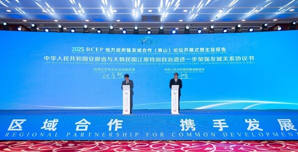 Photo shows the signing of the agreement on further strengthening friendship relationship between east China’s Anhui Province and Gangwon, South Korea during the opening ceremony of the 2025 RCEP Local Governments and Friendship Cities Cooperation (Huangshan) Forum held on June 5, 2025 in Anhui’s Huangshan City.